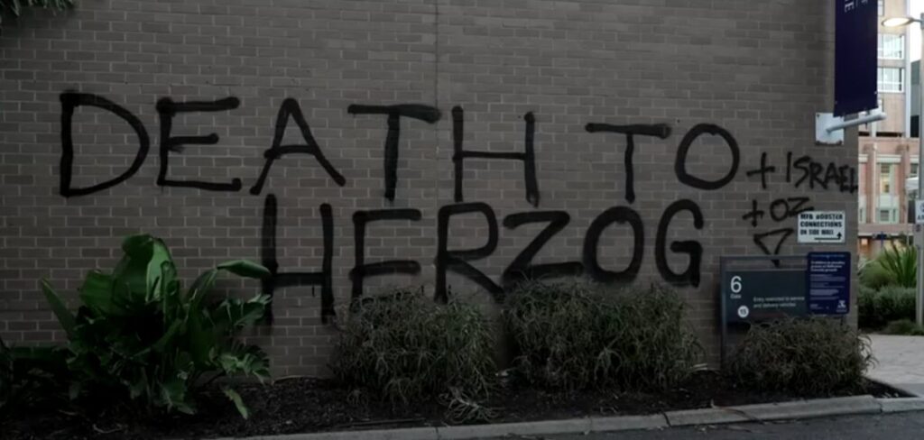 Graffiti by protesters calling for Herzog’s death on a building at Melbourne University read “Death to Herzog + Israel + Oz,” and included an inverted triangle, which has become a pro-Hamas symbol following its use to mark targets in the terror group’s propaganda videos.