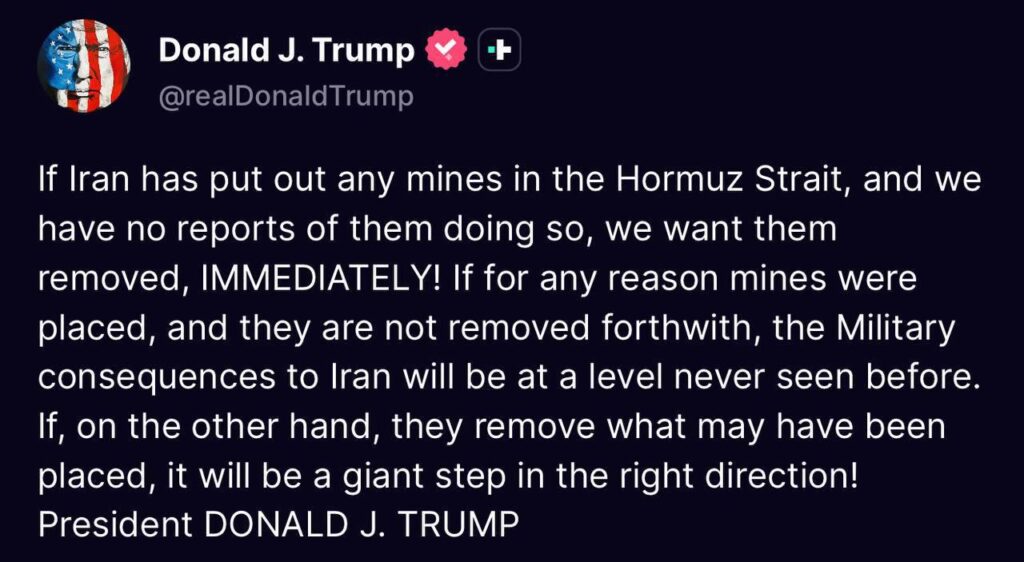 Mar 11, 2026: If Iran has put out any mines in the Hormuz Strait, and we have no reports of them doing so, we want them removed, IMMEDIATELY! If for any reason mines were placed, and they are not removed forthwith, the Military consequences to Iran will be at a level never seen before. If, on the other hand, they remove what may have been placed, it will be a giant step in the right direction! President DONALD J. TRUMP