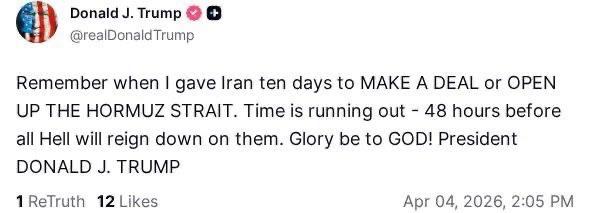 Apr 5, 2026 Apr 5, 2026; Trump: “Iran has 48 hours left to agree to the deal.” To compel Tehran to open the Straits of Hormuz, the U.S. and Israel will strike Iran’s economy. Israel struck Iran’s main energy infrastructure on April 4, 2026. The combined operation plan to target Iran’s oil, gas and other petrochemical assets as well as electricity and other power plants in the coming days. The attack is expected to dramatically spike the price of oil, gas and other energy products worldwide.