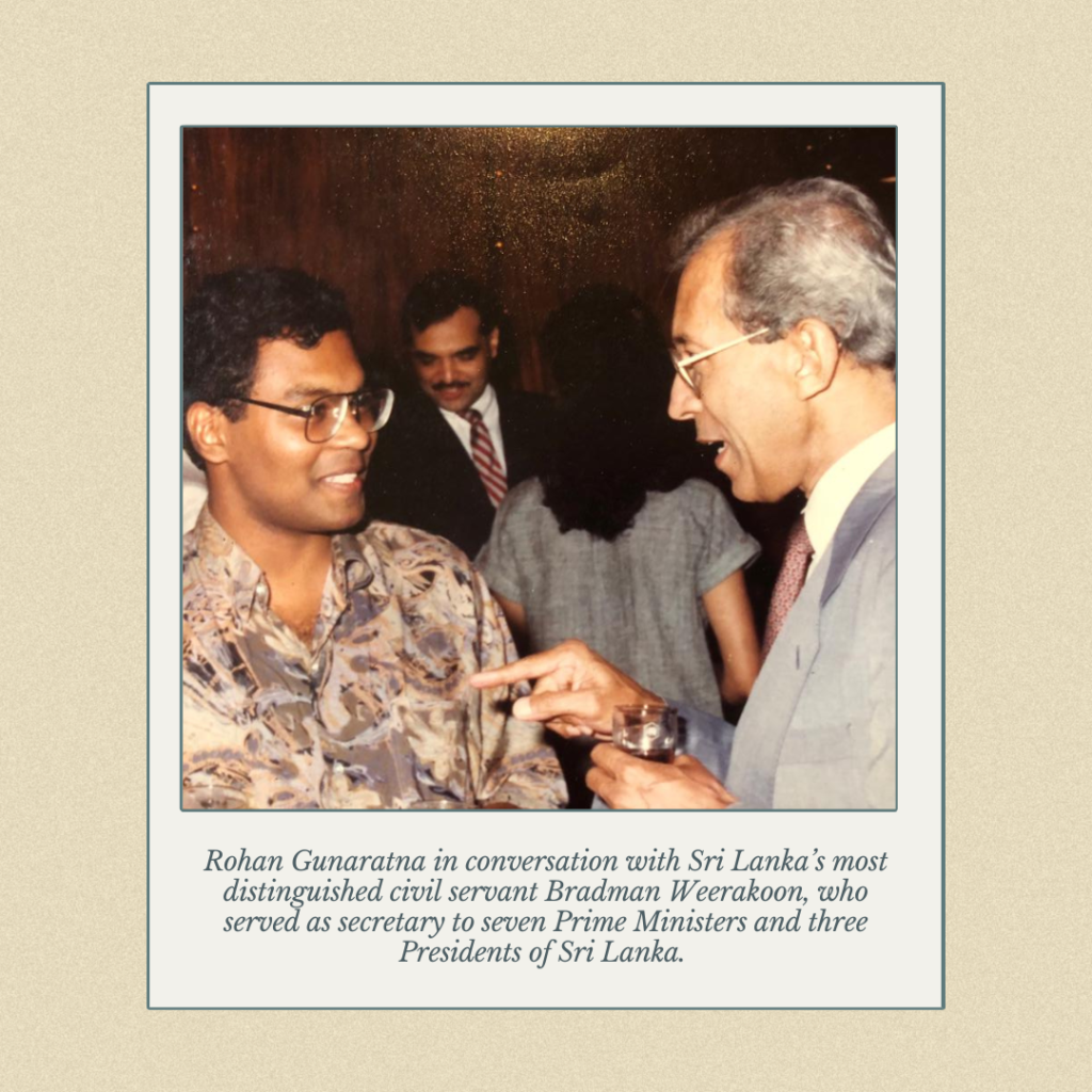 Born in Sri Lanka, he served as the Research Assistant to President J. R. Jayewardena. Gunaratna’s first book manuscript, the Sino-Lankan Connection” was presented by President J. R. Jayewardena to Chairman Deng Xiaoping.